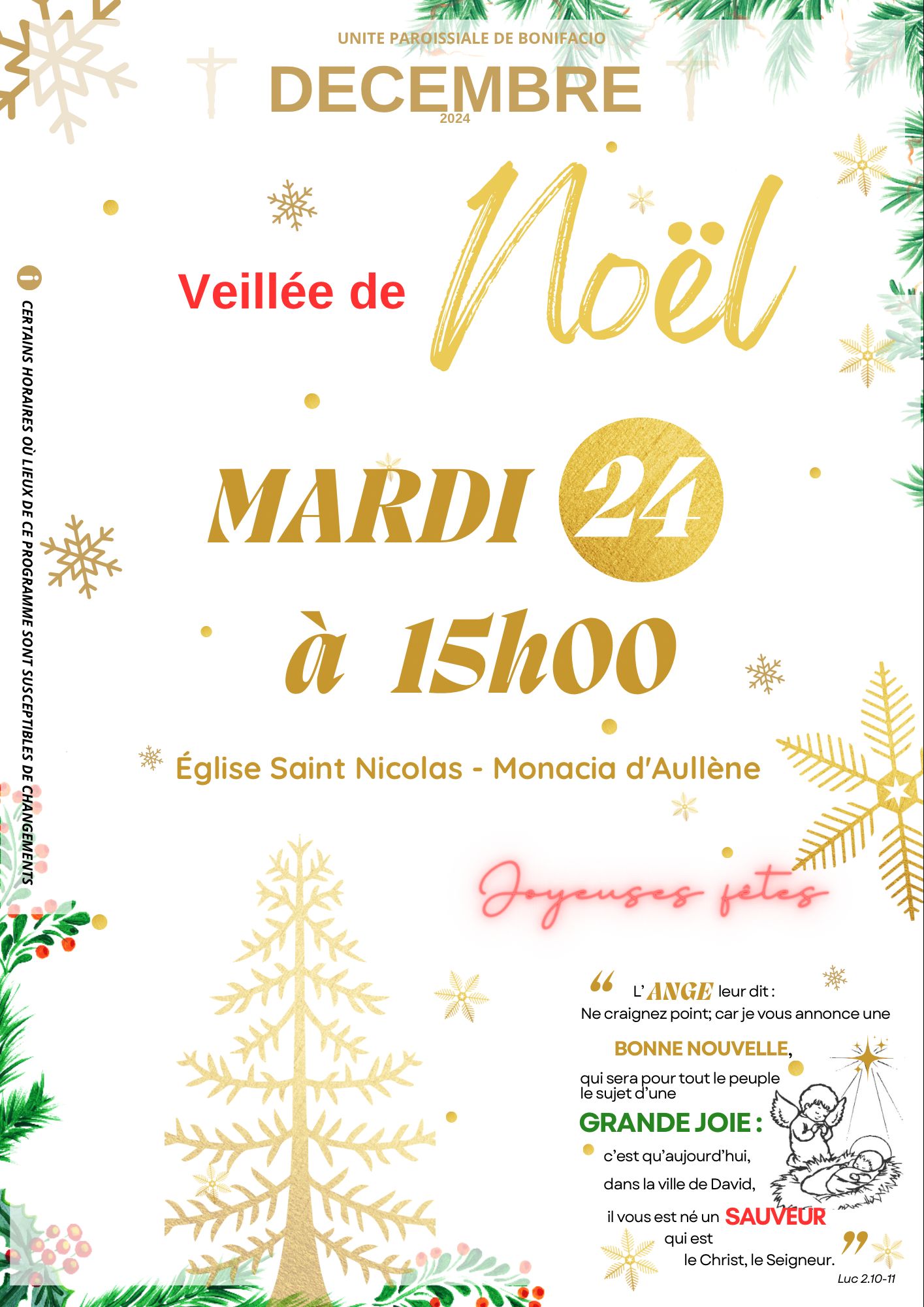 Veillée de Noël – Messe Venez célébrer la fête de Noël lors de la veillée du mardi 24 décembre à 15h00 dans notre église Saint Nicolas à Monacia d’Aullène. Un moment de partage, de recueillement et de joie ancré dans nos traditions. Joyeuses fêtes à tous ! Étiquettes : actualité Date 24 Déc 2024 Expired! Heure 15 h 00 min Lieu Église de Monacia d'Aullène