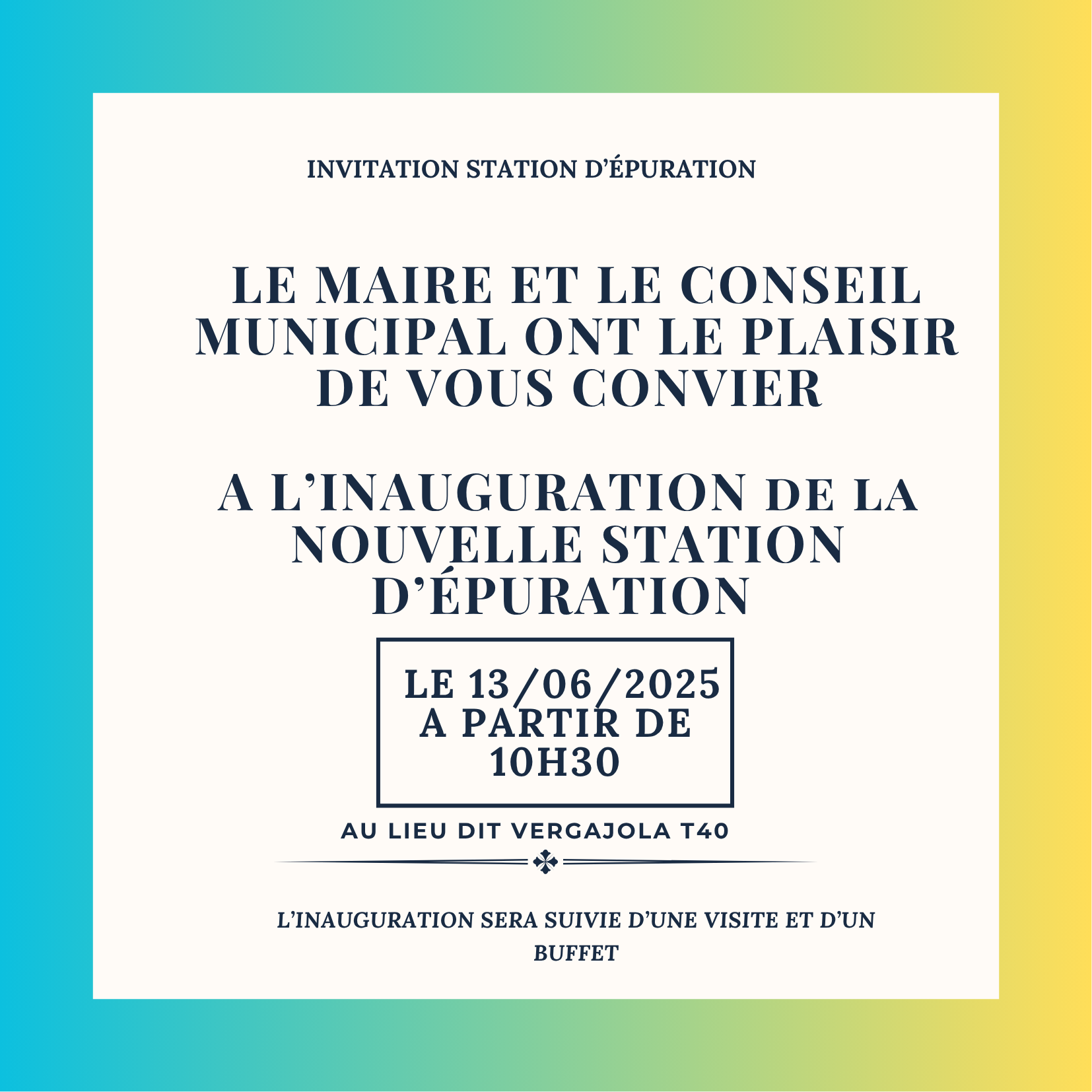 Le Maire et le Conseil municipal ont le plaisir de vous convier à l’inauguration de la nouvelle station d’épuration de la commune, le vendredi 13 juin 2025 à partir de 10h30, au lieu-dit Vergajola T40.