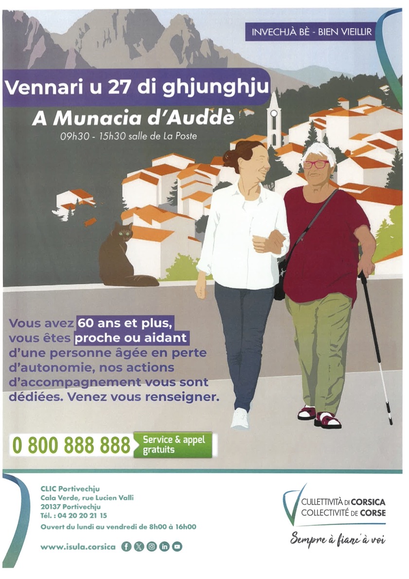 Invechjà bè – Bien vieillir : Réunion publique Actualité Vous avez 60 ans et plus, vous êtes proche ou aidant d’une personne en perte d’autonomie, nos actions d’accompagnement vous sont dédiées. Venez vous renseigner ! 📅 Vendredi 27 juin 2025 📍Salle de La Poste, Monacia 🕐 9h30 – 15h30