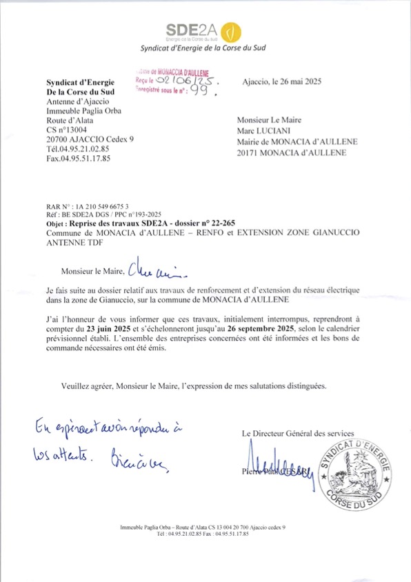 La commune informe la population que les travaux de renforcement et d’extension du réseau électrique menés par le Syndicat d’Énergie de la Corse-du-Sud (SDE 2A) vont reprendre à partir du 23 juin 2025 dans le hameau de Giannuccio.