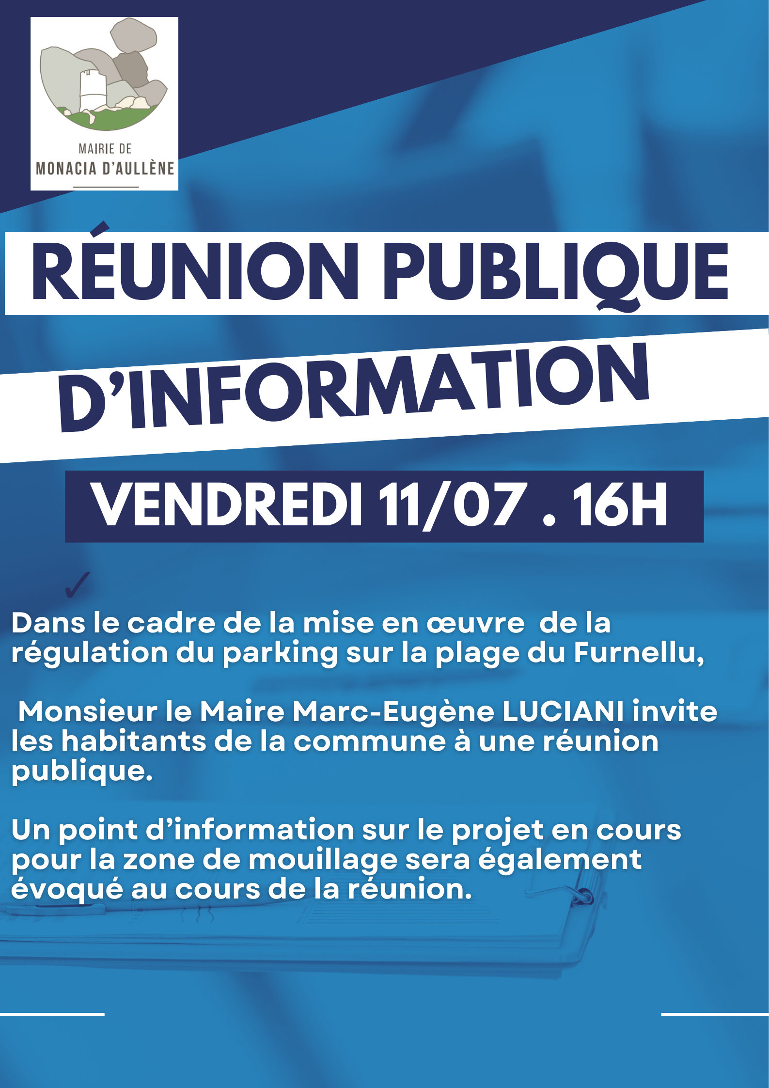 La municipalité de Monacia d’Aullène convie l’ensemble des habitants à une réunion publique d’information le vendredi 11 juillet à 16h.